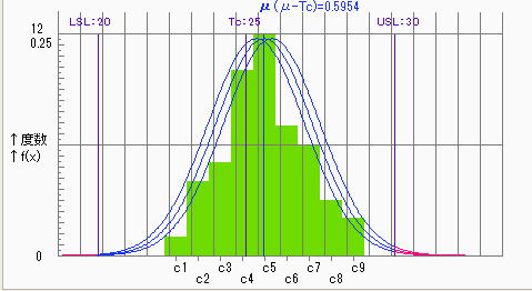 平均値は規格中心値より上側に位置しているがCpkのダウン率は0.12(K=0.88)と、あまり大きな外れではない。不良率は0.1%程度と予測される。