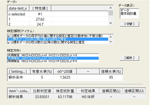 標本サンプルデータの点推定値Ns(μs,σs)から母集団N0(μ0,σ0)を推定する際に、平均は点推定値のまま分散のみ一定の信頼水準(例:95%)で区間推定し、N0(25.59,1.419-δσ~1.419+δσ)として評価することになる。統計理論からは分散変動の方がより厳しい評価となる。